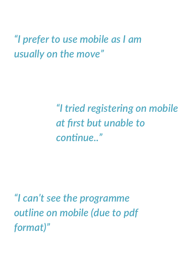 We also conducted usability testing on last year's registration microsite with a invision prototype (as the site is no longer active). This helps to trigger users' memory on their registration experience and also act as a good basis for discovering pain points.