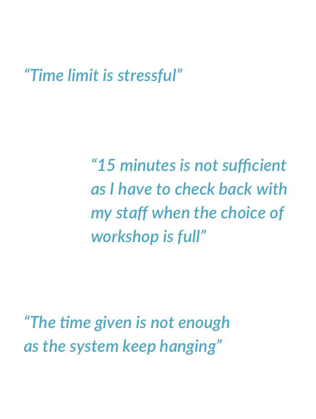 Testing on-site provided some crucial environmental context. Centre Principals are usually either on-the-go or based in their respective Preschools. Office spaces are usually in close proximity to children's activity areas. This can potentially further increase their stress level when registering for the conference.