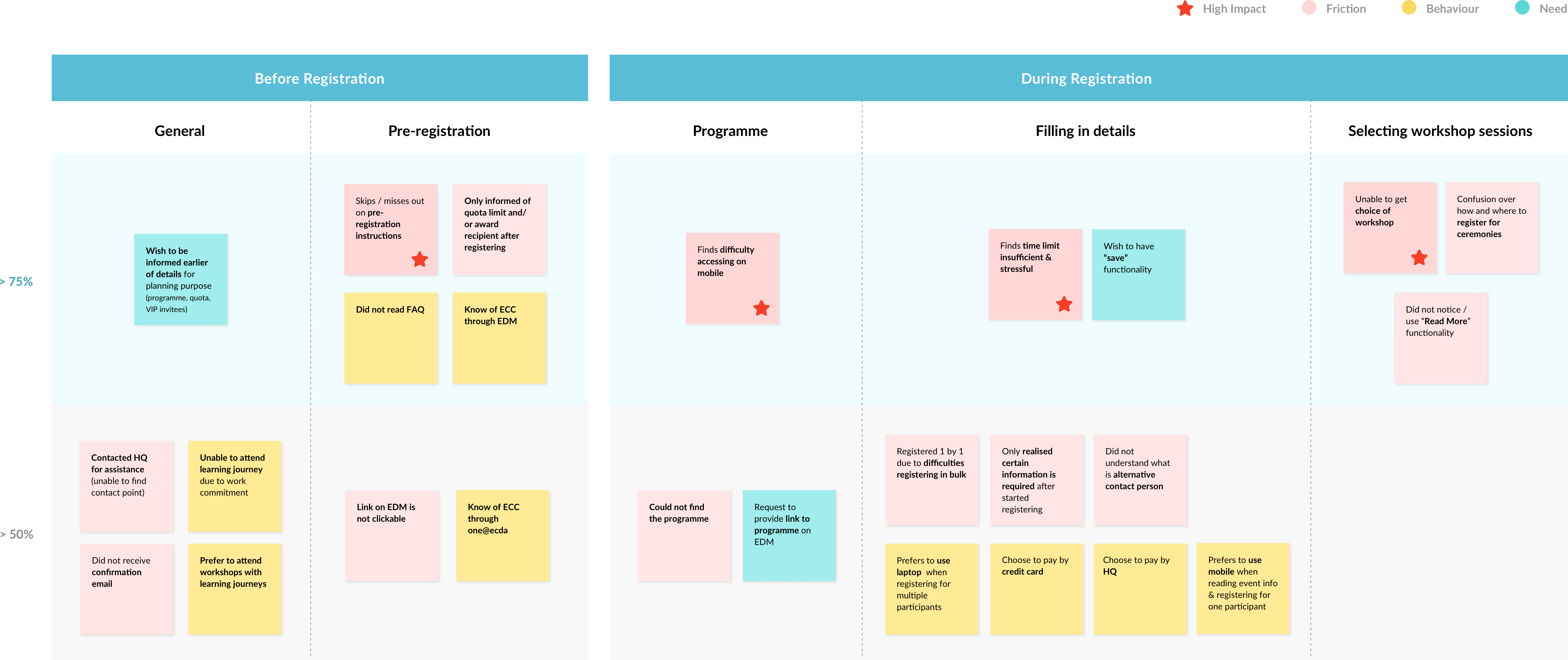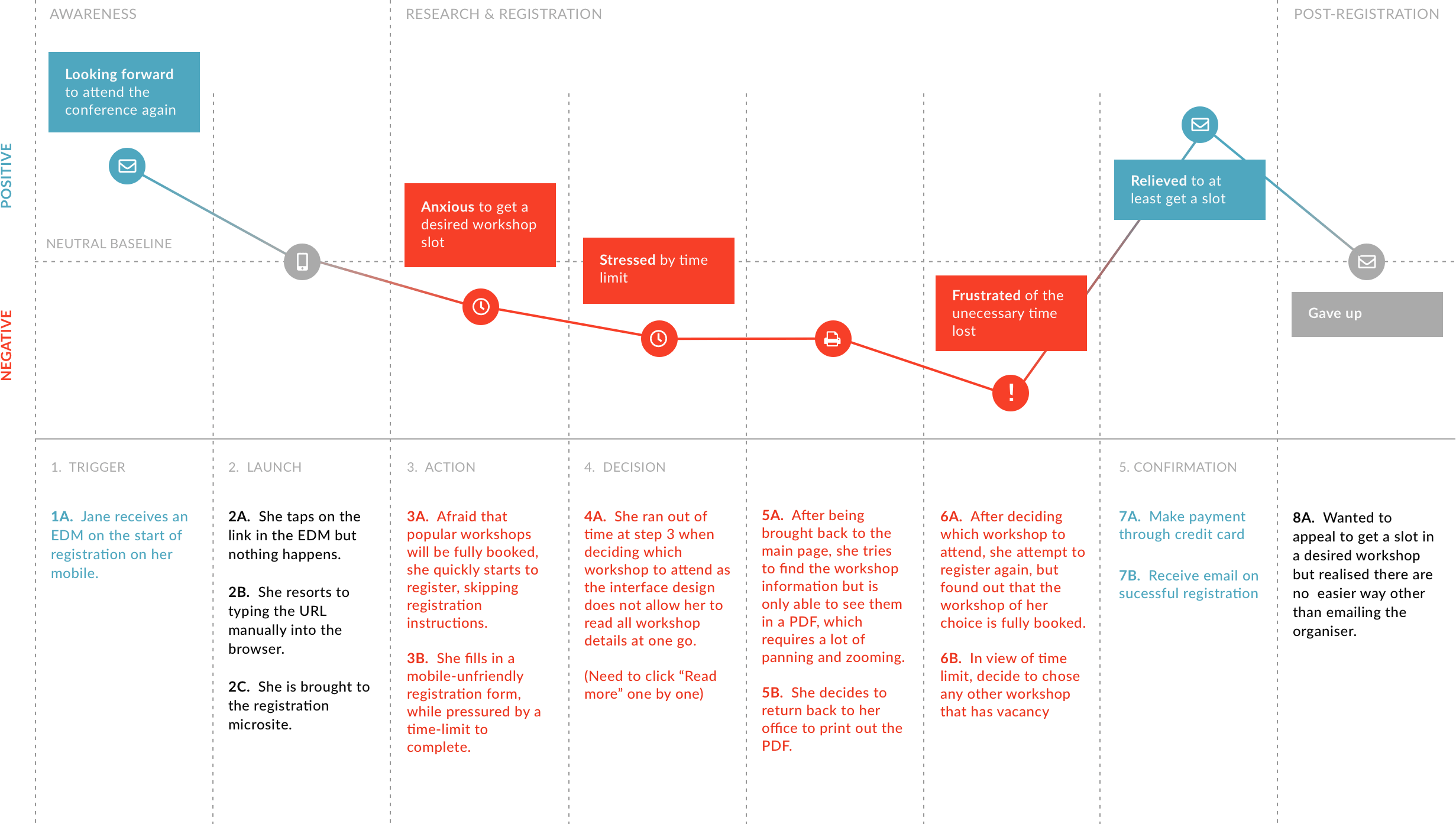 By mapping out the registration journey, we helped Business to better visualise the potential areas that need improvements. The red negative touchpoints reflect the frictions encountered by the Centre Principals when registering for the conference.